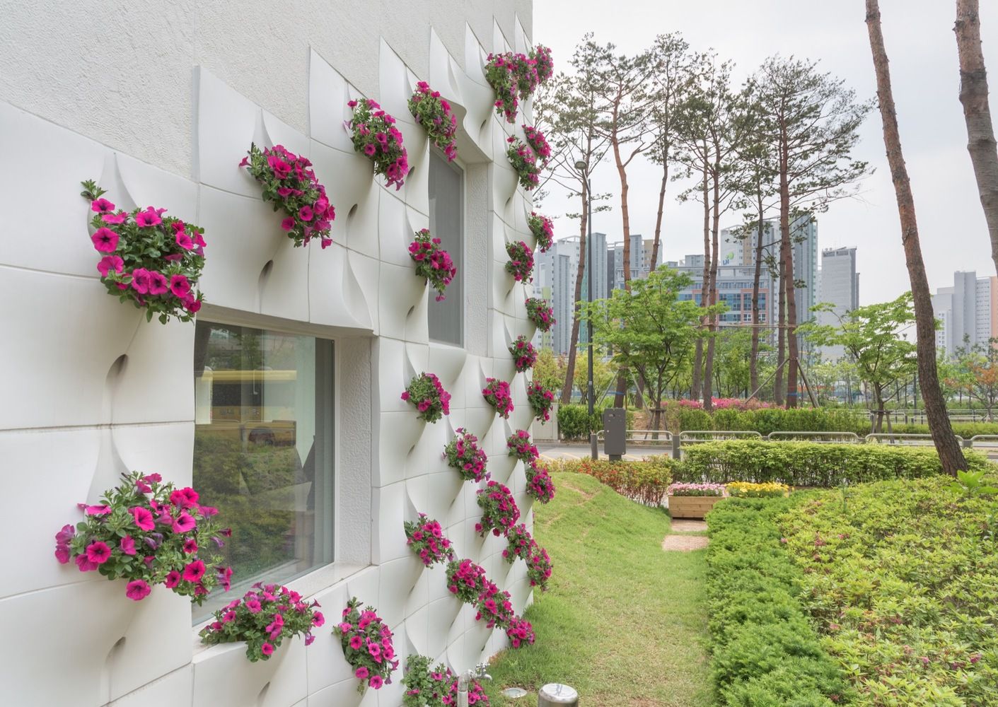 Jungmin Nam has also designed a kindergarten with curvy classrooms and colorful corridors and included the elegant wall garden on the lower half of the building, he says.